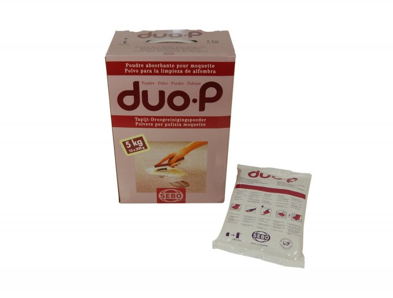 DUO-P halı temizleme tozu, yağlı kirler için güvenli bir çözücü, yağsız kirler için nötr bir şampuan ve yeniden kirlenmeyi geciktirmek için bir anti-kir içeren 100 mikronluk süngersi partiküllerden oluşur. Toz, halı lifleri boyunca fırçayla yedirilirken, kirliliği emerek halıyı temiz, yumuşak ve taze bırakır. Toz süpürüldükten sonrahalı hemen kullanılabilir. DUO-P ayrıca anti-bakteriyel özelliklere sahiptir ve toz akarlarını tamamen ortadan kaldırdığı kanıtlanmıştır.